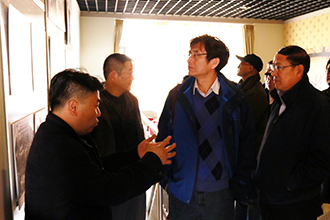 中国美术学院艺术人文学院院长曹意强(左图左二)、我院院长李玉林(左图左一)、我院副院长孟显波(左图右一)观展;交流会现场(右图)